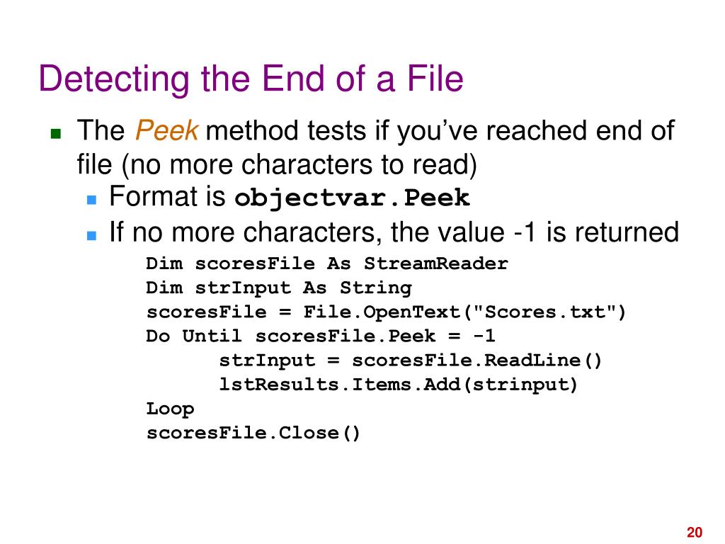 Detecting the End of a File • The Peek method tests if you’ve reached end of file (no more characters to read) • Format is objectvar.Peek • If no more characters, the value -1 is returned Dim scoresFile As StreamReader Dim strInput As String scoresFile = File.OpenText("Scores.txt") Do Until scoresFile.Peek = -1 strInput = scoresFile.ReadLine() lstResults.Items.Add(strinput) Loop scoresFile.Close()