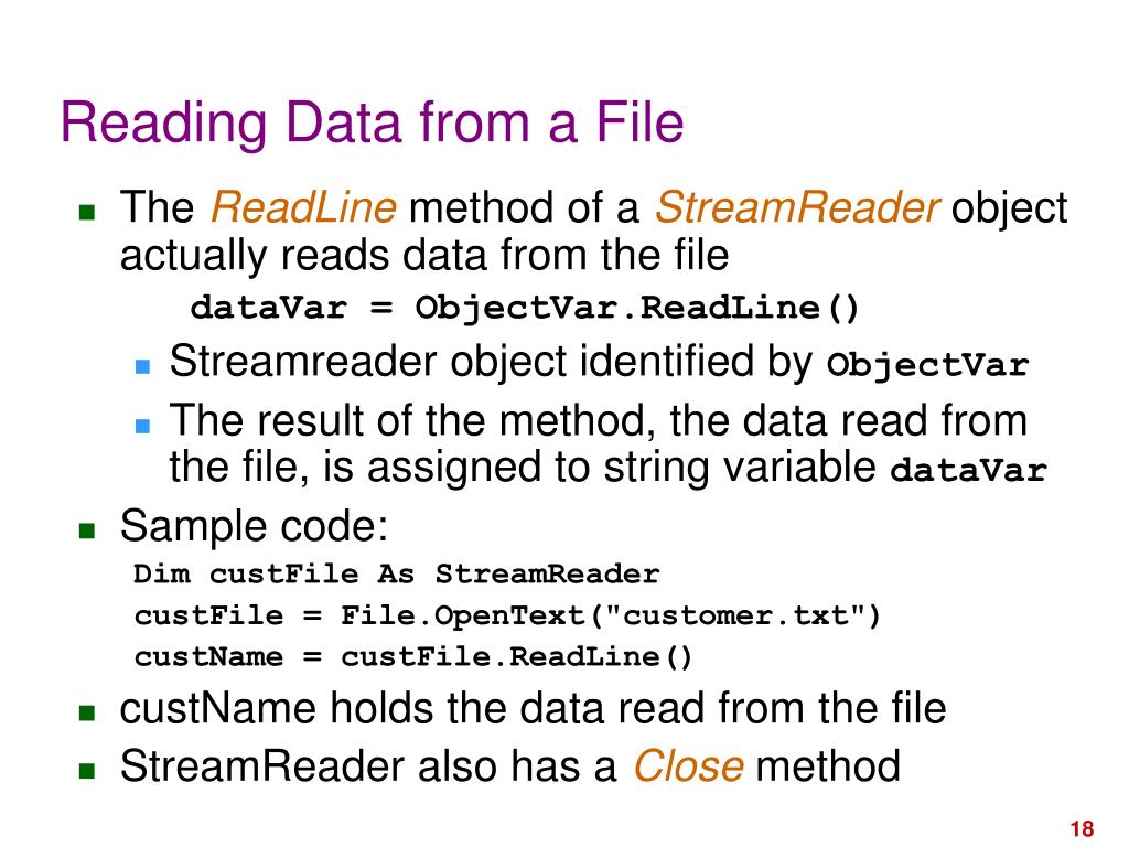 Reading Data from a File • The ReadLine method of a StreamReader object actually reads data from the file dataVar = ObjectVar.ReadLine() • Streamreader object identified by ObjectVar • The result of the method, the data read from the file, is assigned to string variable dataVar • Sample code: Dim custFile As StreamReader custFile = File.OpenText("customer.txt") custName = custFile.ReadLine() • custName holds the data read from the file • StreamReader also has a Close method