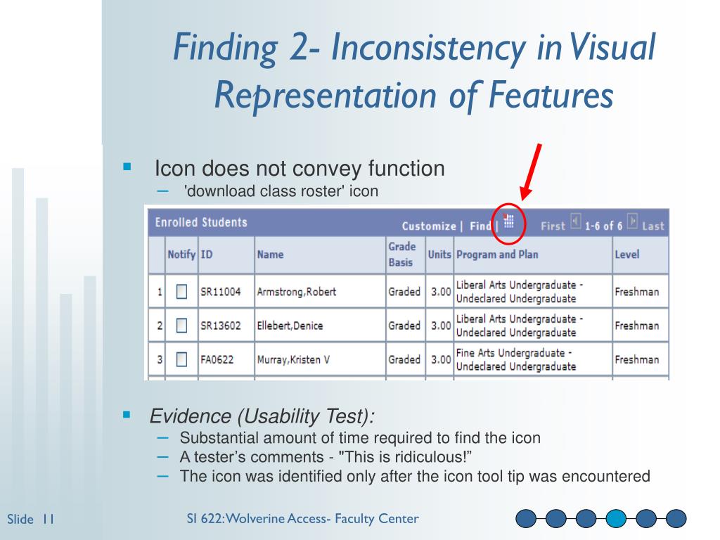 Finding 2- Inconsistency in Visual Representation of Features • Icon does not convey function • 'download class roster' icon • Evidence (Usability Test): • Substantial amount of time required to find the icon • A tester’s comments - "This is ridiculous!” • The icon was identified only after the icon tool tip was encountered SI 622: Wolverine Access- Faculty Center