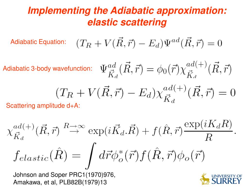 Overview of ADW and adiabatic methods 1.ADW method gives a simple prescription for taking into account coherent , `entangled’, effects of d break-up on (d,p) reactions. 2.Johnson and Soper sought to justify their assumptions (`adiabatic’) by applying the adiabatic idea to 20 MeV elastic d scattering, with some success. 3. They were able to explain some outstanding discrepancies between old DWBA calculations and experiment. New theory could use existing codes and was simple to implement. Need for deuteron optical potentials disappeared. 4.Johnson and Tandy introduced a new approach which made clear that the adiabatic assumption was not a necessary condition for the validity of the J-S method for transfer. Implemented by Laid, Tostevin and Johnson. 5.For application to low energy the big question is `What is the correct 3-body Hamiltonian?’ 6.Validity of adiabatic approximation for elastic scattering investigated by comparison with CDCC calculations. Generalised to 3-body projectiles.