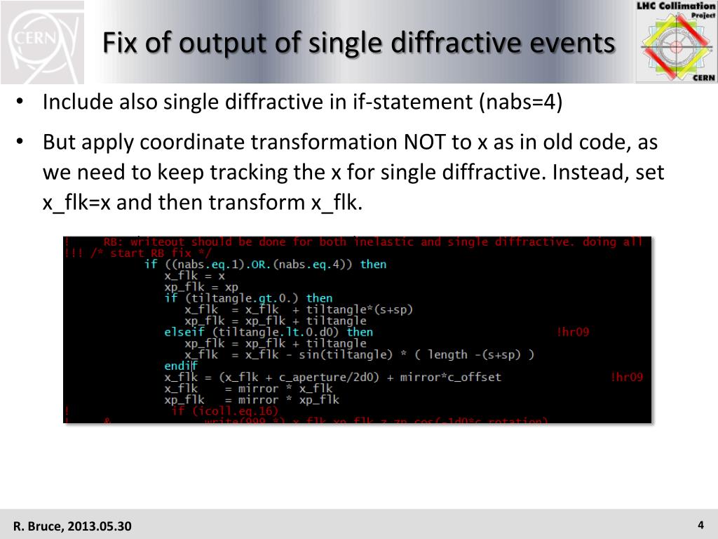 Fix of output of single diffractive events • Include also single diffractive in if-statement (nabs=4) • But apply coordinate transformation NOT to x as in old code, as we need to keep tracking the x for single diffractive. Instead, set x_flk=x and then transform x_flk.