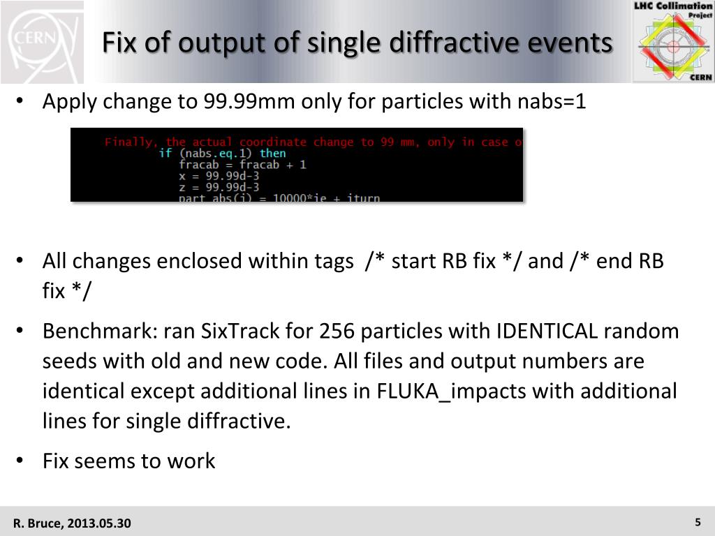 Fix of output of single diffractive events • Apply change to 99.99mm only for particles with nabs=1 • All changes enclosed within tags /* start RB fix */ and /* end RB fix */ • Benchmark: ran SixTrack for 256 particles with IDENTICAL random seeds with old and new code. All files and output numbers are identical except additional lines in FLUKA_impacts with additional lines for single diffractive. • Fix seems to work