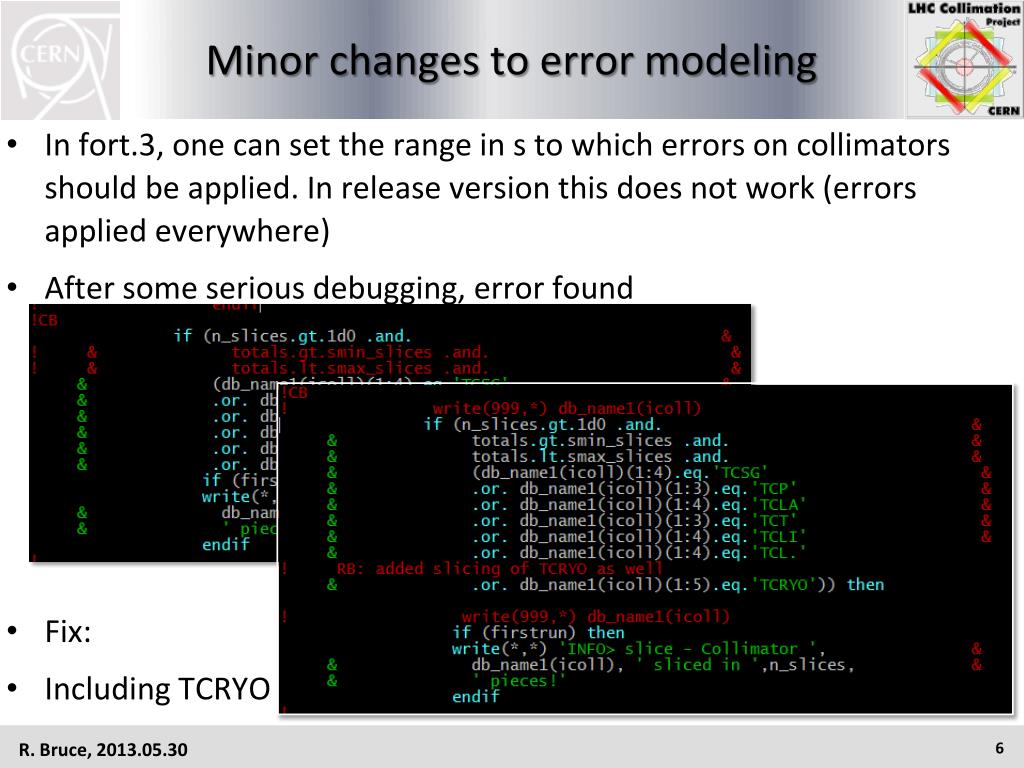 Minor changes to error modeling • In fort.3, one can set the range in s to which errors on collimators should be applied. In release version this does not work (errors applied everywhere) • After some serious debugging, error found • Fix: • Including TCRYO