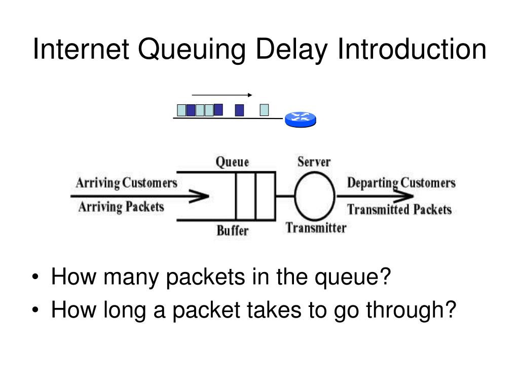 Internet Queuing Delay Introduction • How many packets in the queue? • How long a packet takes to go through?