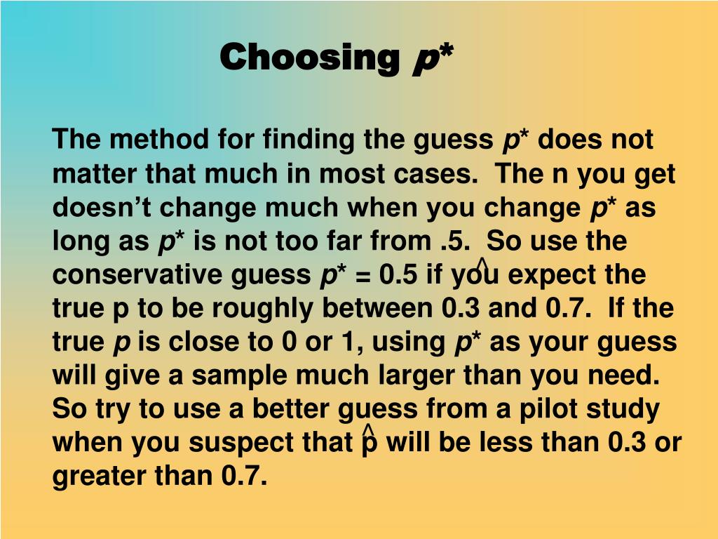 Choosing p* The method for finding the guess p* does not matter that much in most cases. The n you get doesn’t change much when you change p* as long as p* is not too far from .5. So use the conservative guess p* = 0.5 if you expect the true p to be roughly between 0.3 and 0.7. If the true p is close to 0 or 1, using p* as your guess will give a sample much larger than you need. So try to use a better guess from a pilot study when you suspect that p will be less than 0.3 or greater than 0.7. ^ ^