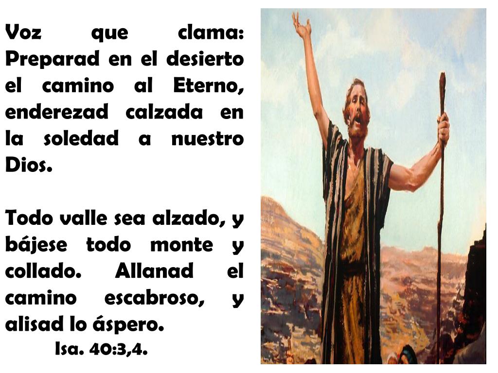 Voz que clama: Preparad en el desierto el camino al Eterno, enderezad calzada en la soledad a nuestro Dios. Todo valle sea alzado, y bájese todo monte y collado. Allanad el camino escabroso, y alisad lo áspero. Isa. 40:3,4.