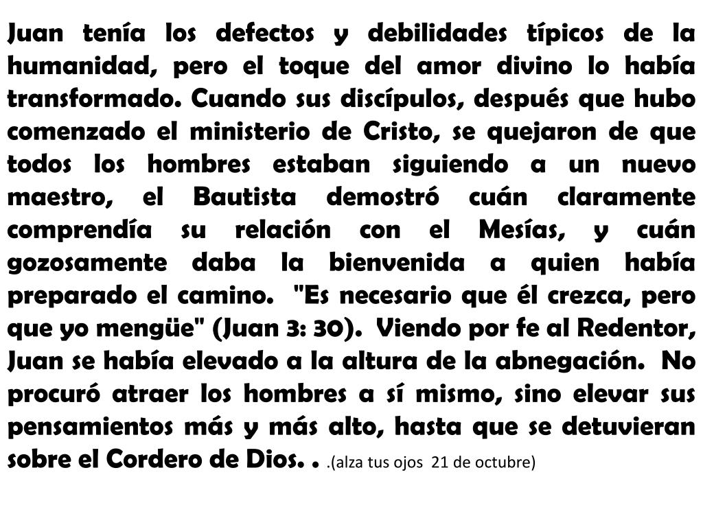 Juan tenía los defectos y debilidades típicos de la humanidad, pero el toque del amor divino lo había transformado. Cuando sus discípulos, después que hubo comenzado el ministerio de Cristo, se quejaron de que todos los hombres estaban siguiendo a un nuevo maestro, el Bautista demostró cuán claramente comprendía su relación con el Mesías, y cuán gozosamente daba la bienvenida a quien había preparado el camino. "Es necesario que él crezca, pero que yo mengüe" (Juan 3: 30). Viendo por fe al Redentor, Juan se había elevado a la altura de la abnegación. No procuró atraer los hombres a sí mismo, sino elevar sus pensamientos más y más alto, hasta que se detuvieran sobre el Cordero de Dios. . .(alza tus ojos 21 de octubre)