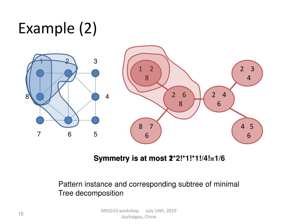 Example (2) 1 2 3 8 4 7 6 5 • 2 • 8 2 3 4 2 6 8 2 4 6 Symmetry is at most 1 Symmetry is at most 2*2!*1!*1!/4!=1/6 8 7 6 4 5 6 Pattern instance and corresponding subtree of minimal Tree decomposition IWGD10 workshop July 14th, 2010 Jiuzhaigou, China