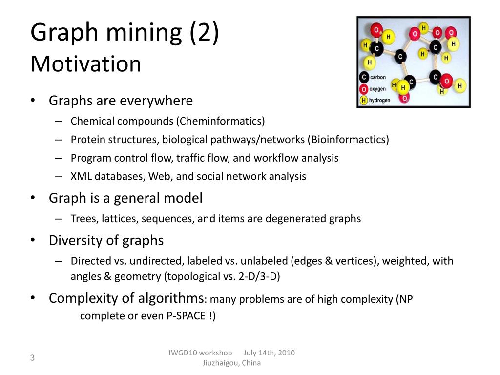 Graph mining (2)Motivation • Graphs are everywhere • Chemical compounds (Cheminformatics) • Protein structures, biological pathways/networks (Bioinformactics) • Program control flow, traffic flow, and workflow analysis • XML databases, Web, and social network analysis • Graph is a general model • Trees, lattices, sequences, and items are degenerated graphs • Diversity of graphs • Directed vs. undirected, labeled vs. unlabeled (edges & vertices), weighted, with angles & geometry (topological vs. 2-D/3-D) • Complexity of algorithms: many problems are of high complexity (NP complete or even P-SPACE !) IWGD10 workshop July 14th, 2010 Jiuzhaigou, China