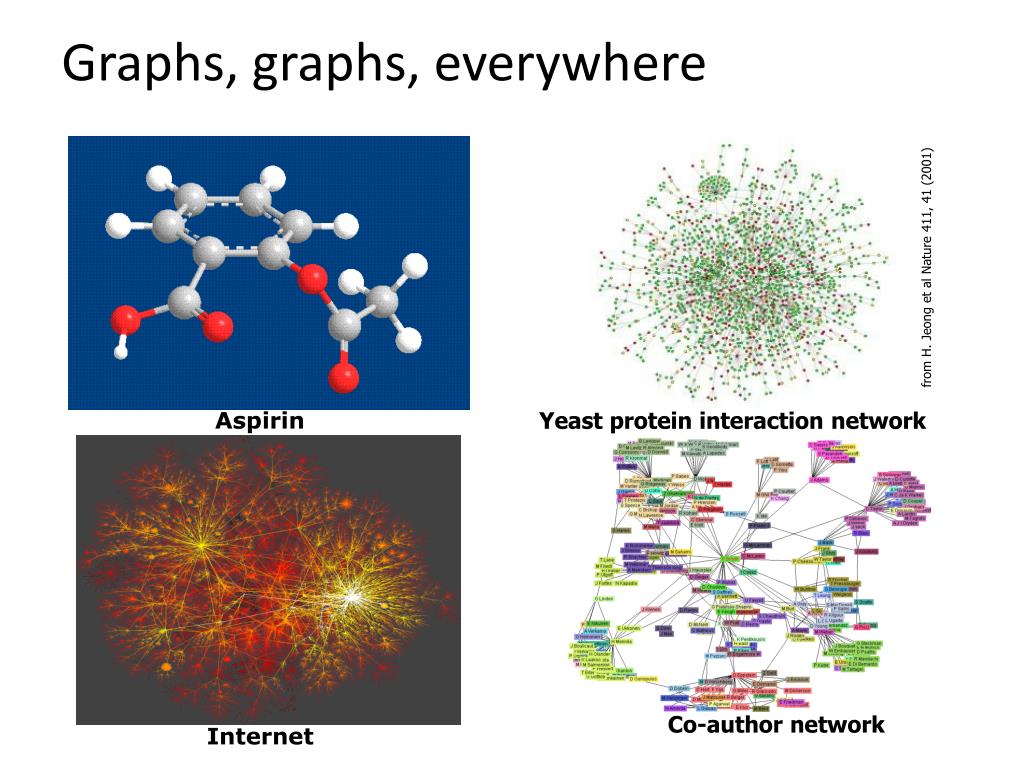 Graphs, graphs, everywhere from H. Jeong et al Nature 411, 41 (2001) Aspirin Yeast protein interaction network Co-author network Internet