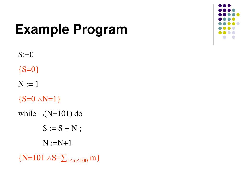Example Program S:=0 {S=0} N := 1 {S=0 N=1} while {1 N 101 S=∑1mN-1 m}(N=101) do S := S + N ; {1 N < 101 S=∑1mN m} N :=N+1 {N=101 S=∑1m100 m}