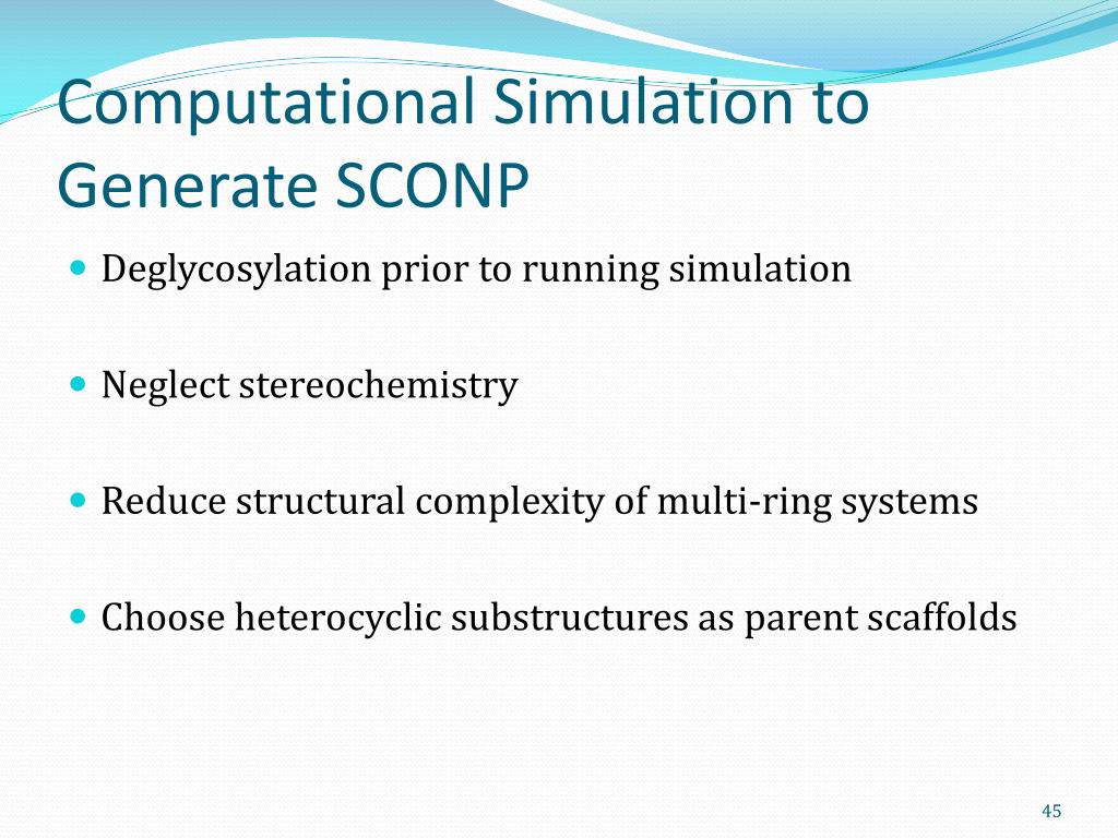 Computational Simulation to Generate SCONP • Deglycosylation prior to running simulation • Neglect stereochemistry • Reduce structural complexity of multi-ring systems • Choose heterocyclic substructures as parent scaffolds