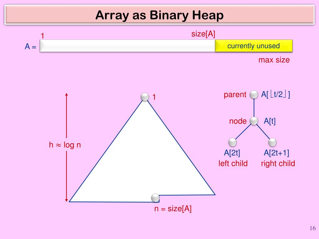 size[A] 1 A = currently unused max size 1 A[ t/2 ] parent node A[t] h log n A[2t] A[2t+1] left child right child n = size[A] Array as Binary Heap