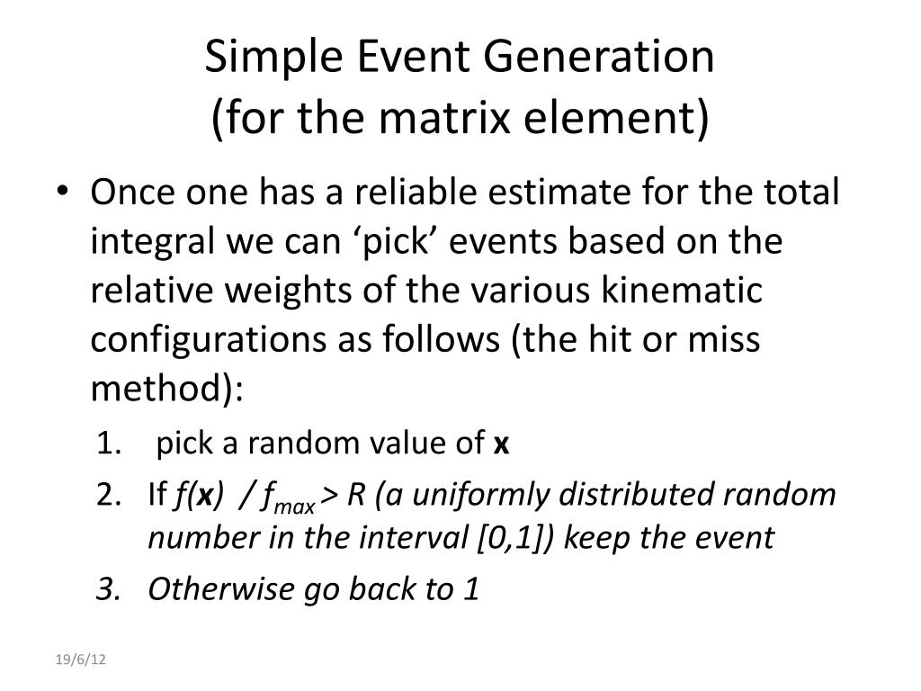 Simple Event Generation (for the matrix element) • Once one has a reliable estimate for the total integral we can ‘pick’ events based on the relative weights of the various kinematic configurations as follows (the hit or miss method): • pick a random value of x • If f(x) / fmax> R (a uniformly distributed random number in the interval [0,1]) keep the event • Otherwise go back to 1