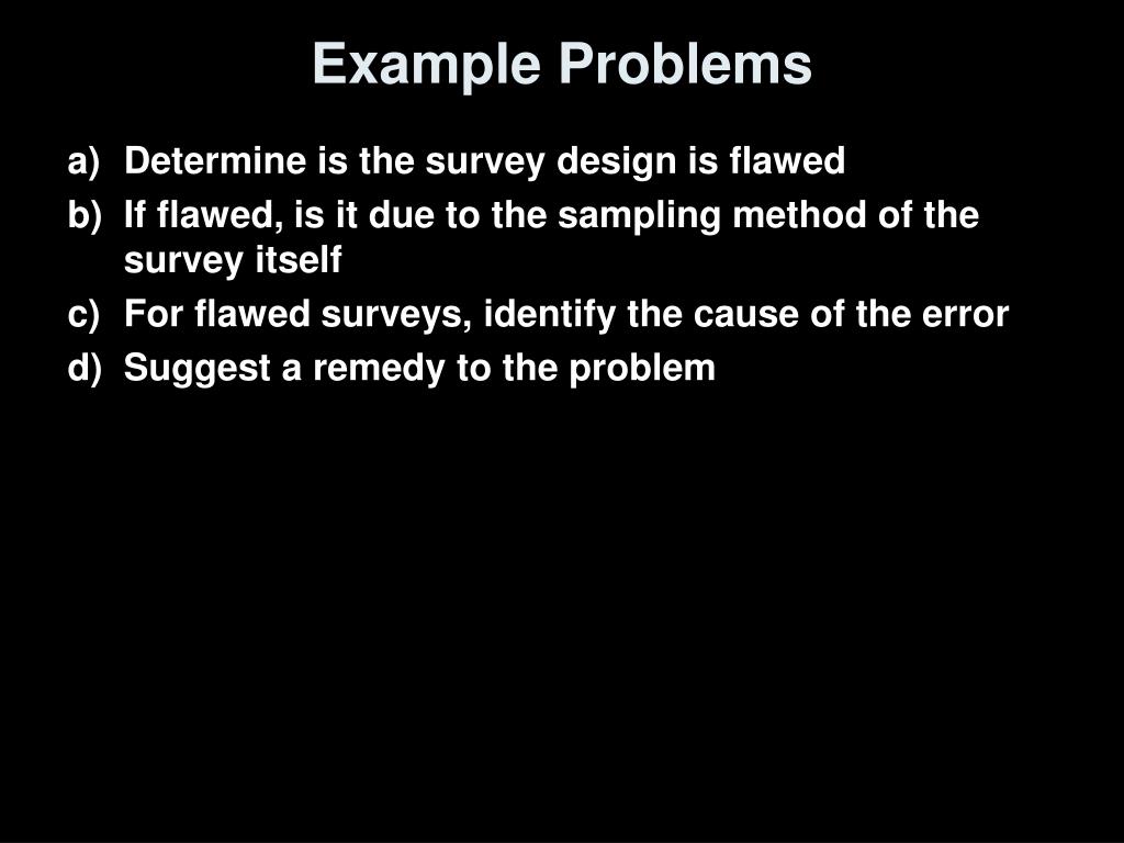 Example Problems • Determine is the survey design is flawed • If flawed, is it due to the sampling method of the survey itself • For flawed surveys, identify the cause of the error • Suggest a remedy to the problem