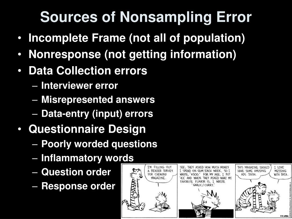 Sources of Nonsampling Error • Incomplete Frame (not all of population) • Nonresponse (not getting information) • Data Collection errors • Interviewer error • Misrepresented answers • Data-entry (input) errors • Questionnaire Design • Poorly worded questions • Inflammatory words • Question order • Response order