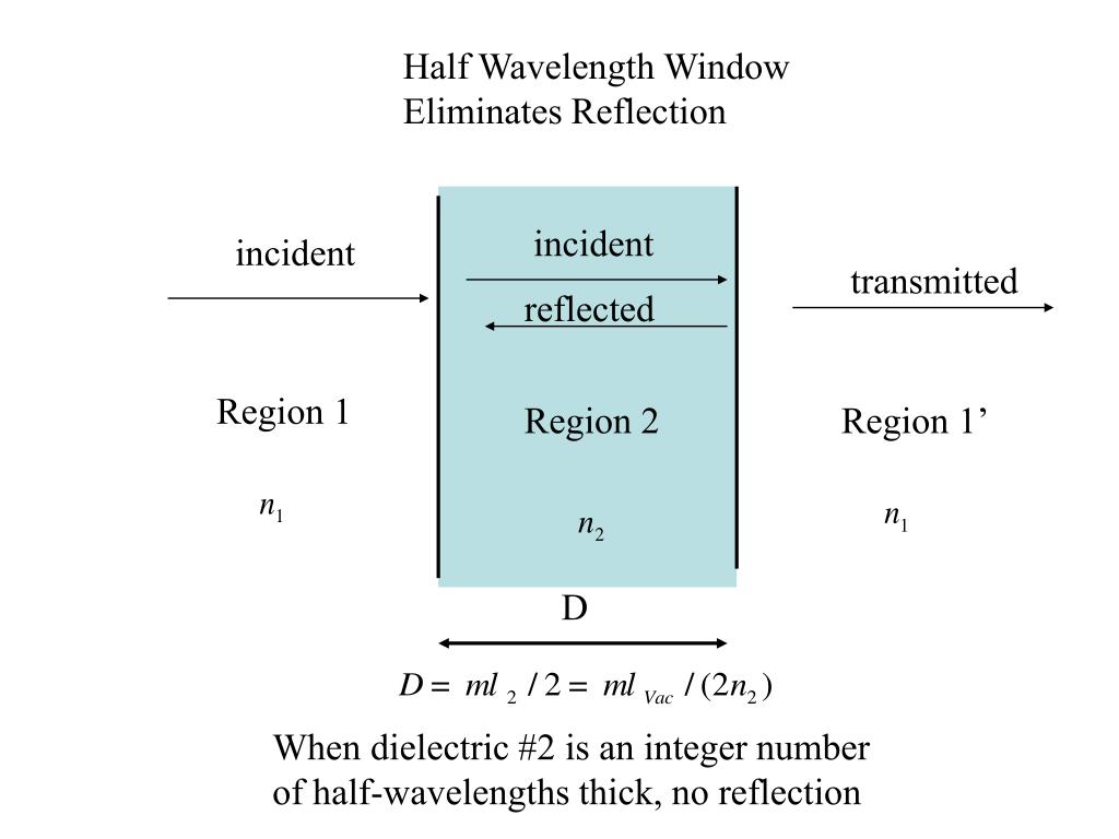 Half Wavelength Window Eliminates Reflection incident incident transmitted reflected Region 1 Region 2 Region 1’ D When dielectric #2 is an integer number of half-wavelengths thick, no reflection