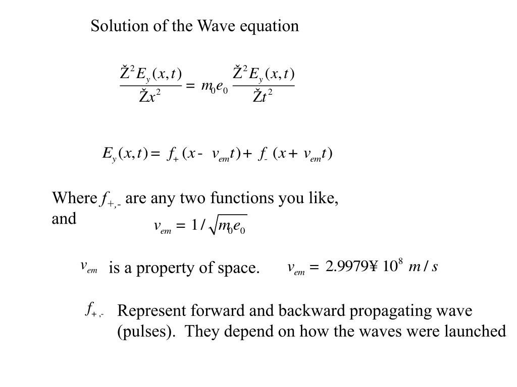 Solution of the Wave equation Where f+,- are any two functions you like, and is a property of space. Represent forward and backward propagating wave (pulses). They depend on how the waves were launched