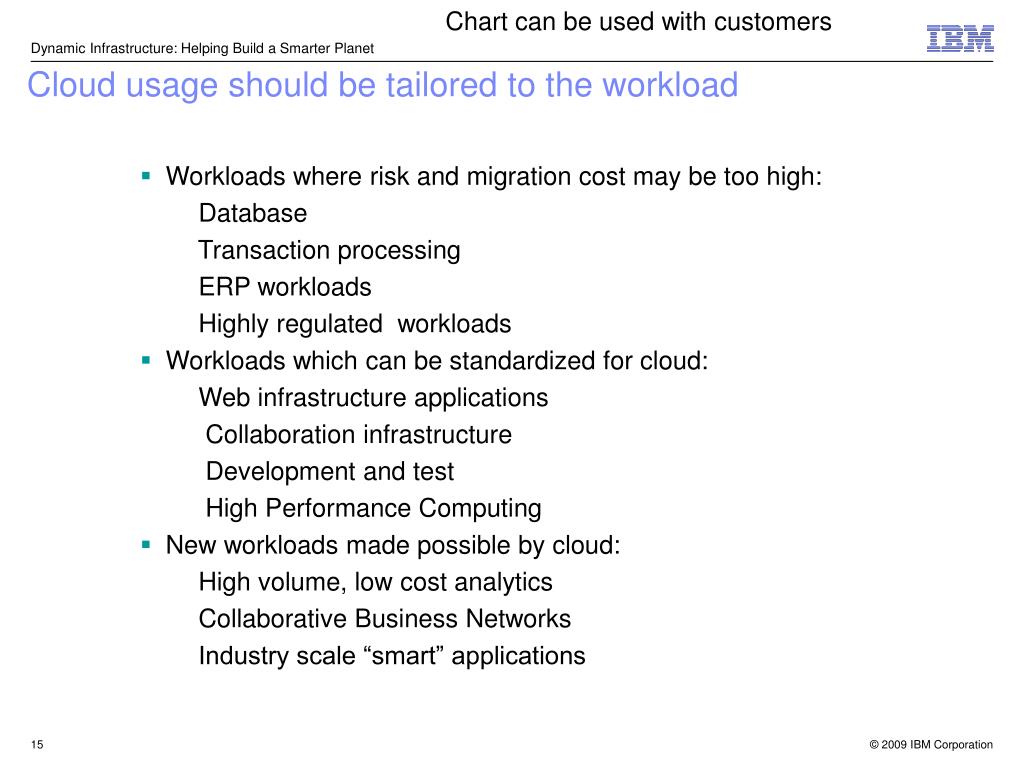 Chart can be used with customers Cloud usage should be tailored to the workload • Workloads where risk and migration cost may be too high: • Database • Transaction processing • ERP workloads • Highly regulated workloads • Workloads which can be standardized for cloud: • Web infrastructure applications • Collaboration infrastructure • Development and test • High Performance Computing • New workloads made possible by cloud: • High volume, low cost analytics • Collaborative Business Networks • Industry scale “smart” applications