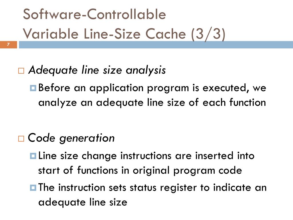 Software-Controllable Variable Line-Size Cache (3/3) • Adequate line size analysis • Before an application program is executed, we analyze an adequate line size of each function • Code generation • Line size change instructions are inserted into start of functions in original program code • The instruction sets status register to indicate an adequate line size