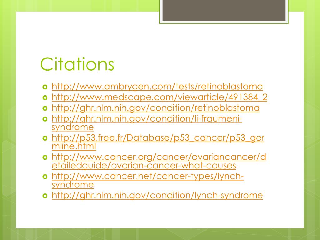 Citations • http://www.ambrygen.com/tests/retinoblastoma • http://www.medscape.com/viewarticle/491384_2 • http://ghr.nlm.nih.gov/condition/retinoblastoma • http://ghr.nlm.nih.gov/condition/li-fraumeni-syndrome • http://p53.free.fr/Database/p53_cancer/p53_germline.html • http://www.cancer.org/cancer/ovariancancer/detailedguide/ovarian-cancer-what-causes • http://www.cancer.net/cancer-types/lynch-syndrome • http://ghr.nlm.nih.gov/condition/lynch-syndrome