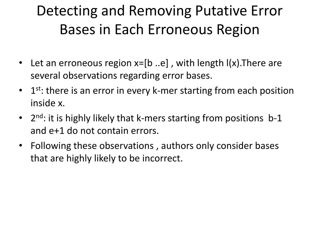 Detecting and Removing Putative Error Bases in Each Erroneous Region • Let an erroneous region x=[b ..e] , with length l(x).There are several observations regarding error bases. • 1st: there is an error in every k-mer starting from each position inside x. • 2nd: it is highly likely that k-mers starting from positions b-1 and e+1 do not contain errors. • Following these observations , authors only consider bases that are highly likely to be incorrect.