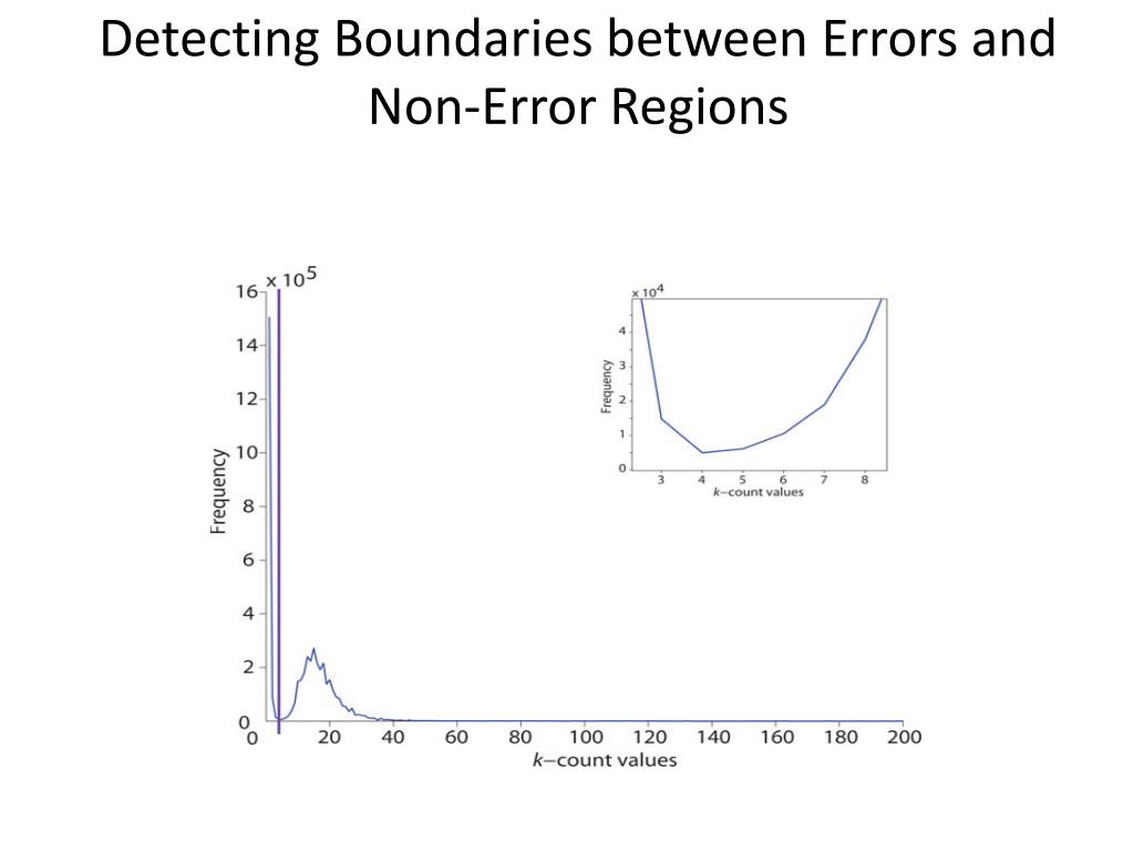 Finding the Error Threshold-KEC • It was observed in [chaisson, Zhao], that it is not necessary to explicitly consider the model for the distribution, because the first minimum of f(v) satisfactorily separates different distributions, and therefore can be used as the error threshold. • However, this approach is not applicable to the amplicon data. • The first minimum of f(v) is always equal to 0. • Authors define the end of the first sufficiently long segment of the consecutive 0’s of f(v) as the error threshold ter. • In their experiments, the length of the segment equal to k was adequate.