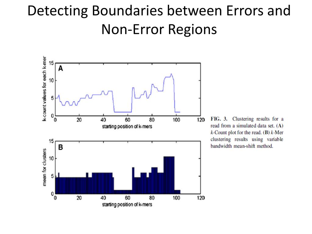 Finding the Error Regions-KEC • sequentially find isolated segments [i,j] such that for every pє[i,j] KCk(p) <= ter. • the k-mers of the read are clustered according to their k-counts using clustering by the variable bandwidth mean-shift method, using FAMS software. • every segment is extended in both directions by adding consecutive positions q by the following rule: q is added if and only if there exists pє[i,j] such, that k-mersSk(p) and Sk(q) belong to the same cluster. Overlapping segments are joined, and the obtained segments are error regions.