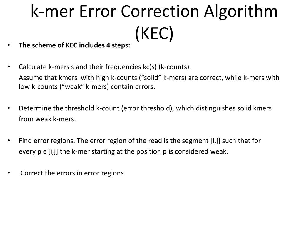 k-mer Error Correction Algorithm (KEC) • The scheme of KEC includes 4 steps: • Calculate k-mers s and their frequencies kc(s) (k-counts). Assume that kmers with high k-counts (“solid” k-mers) are correct, while k-mers with low k-counts (“weak” k-mers) contain errors. • Determine the threshold k-count (error threshold), which distinguishes solid kmers from weak k-mers. • Find error regions. The error region of the read is the segment [i,j] such that for every p є [i,j] the k-mer starting at the position p is considered weak. • Correct the errors in error regions