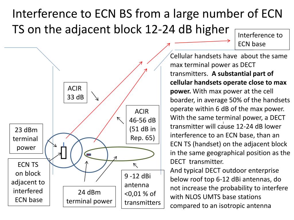 Interference to ECN base Cellular handsets have about the same max terminal power as DECT transmitters. A substantial part of cellular handsets operate close to max power. With max power at the cell boarder, in average 50% of the handsets operate within 6 dB of the max power. With the same terminal power, a DECT transmitter will cause 12-24 dB lower interference to an ECN base, than an ECN TS (handset) on the adjacent block in the same geographical position as the DECT transmitter. And typical DECT outdoor enterprise below roof top 6-12 dBi antennas, do not increase the probability to interfere with NLOS UMTS base stations compared to an isotropic antenna Interference to ECN BS from a large number of ECN TS on the adjacent block 12-24 dB higher ACIR 33 dB ACIR 46-56 dB (51 dB in Rep. 65) 23 dBm terminal power ECN TS on block adjacent to interfered ECN base 9 -12 dBi antenna <0,01 % of transmitters 24 dBm terminal power