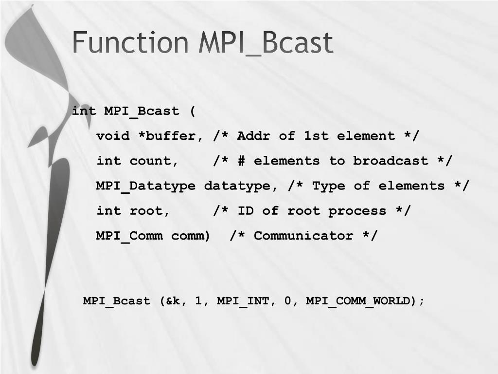 Function MPI_Bcast intMPI_Bcast ( void *buffer, /* Addr of 1st element */ int count, /* # elements to broadcast */ MPI_Datatypedatatype, /* Type of elements */ int root, /* ID of root process */ MPI_Commcomm) /* Communicator */ MPI_Bcast (&k, 1, MPI_INT, 0, MPI_COMM_WORLD);