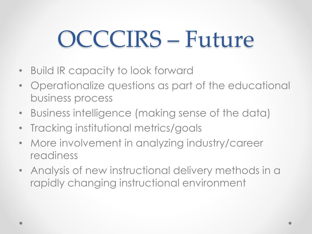 OCCCIRS – Future • Build IR capacity to look forward • Operationalize questions as part of the educational business process • Business intelligence (making sense of the data) • Tracking institutional metrics/goals • More involvement in analyzing industry/career readiness • Analysis of new instructional delivery methodsin a rapidly changing instructional environment