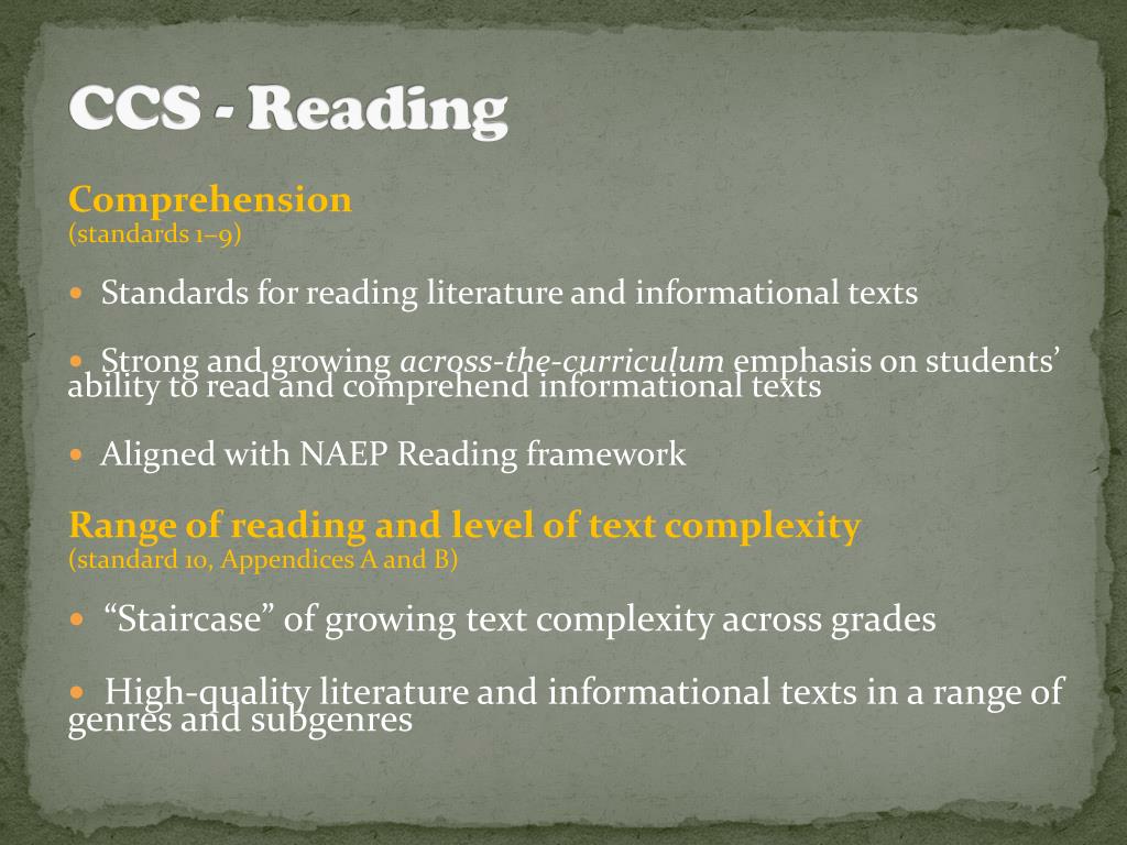CCS - Reading Comprehension (standards 1−9) • Standards for reading literature and informational texts • Strong and growing across-the-curriculum emphasis on students’ ability to read and comprehend informational texts • Aligned with NAEP Reading framework Range of reading and level of text complexity (standard 10, Appendices A and B) • “Staircase” of growing text complexity across grades • High-quality literature and informational texts in a range of genres and subgenres