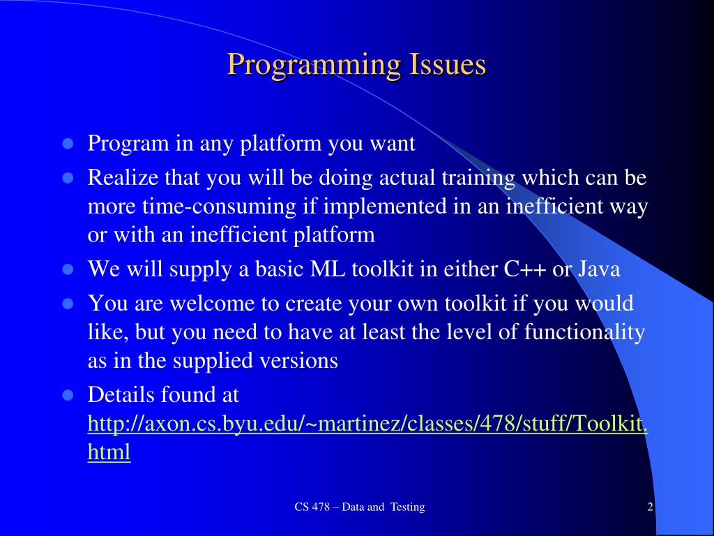 Programming Issues • Program in any platform you want • Realize that you will be doing actual training which can be more time-consuming if implemented in an inefficient way or with an inefficient platform • We will supply a basic ML toolkit in either C++ or Java • You are welcome to create your own toolkit if you would like, but you need to have at least the level of functionality as in the supplied versions • Details found at http://axon.cs.byu.edu/~martinez/classes/478/stuff/Toolkit.html CS 478 – Data and Testing