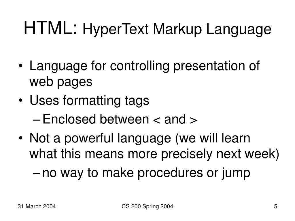 HTML: HyperText Markup Language • Language for controlling presentation of web pages • Uses formatting tags • Enclosed between < and > • Not a powerful language (we will learn what this means more precisely next week) • no way to make procedures or jump CS 200 Spring 2004