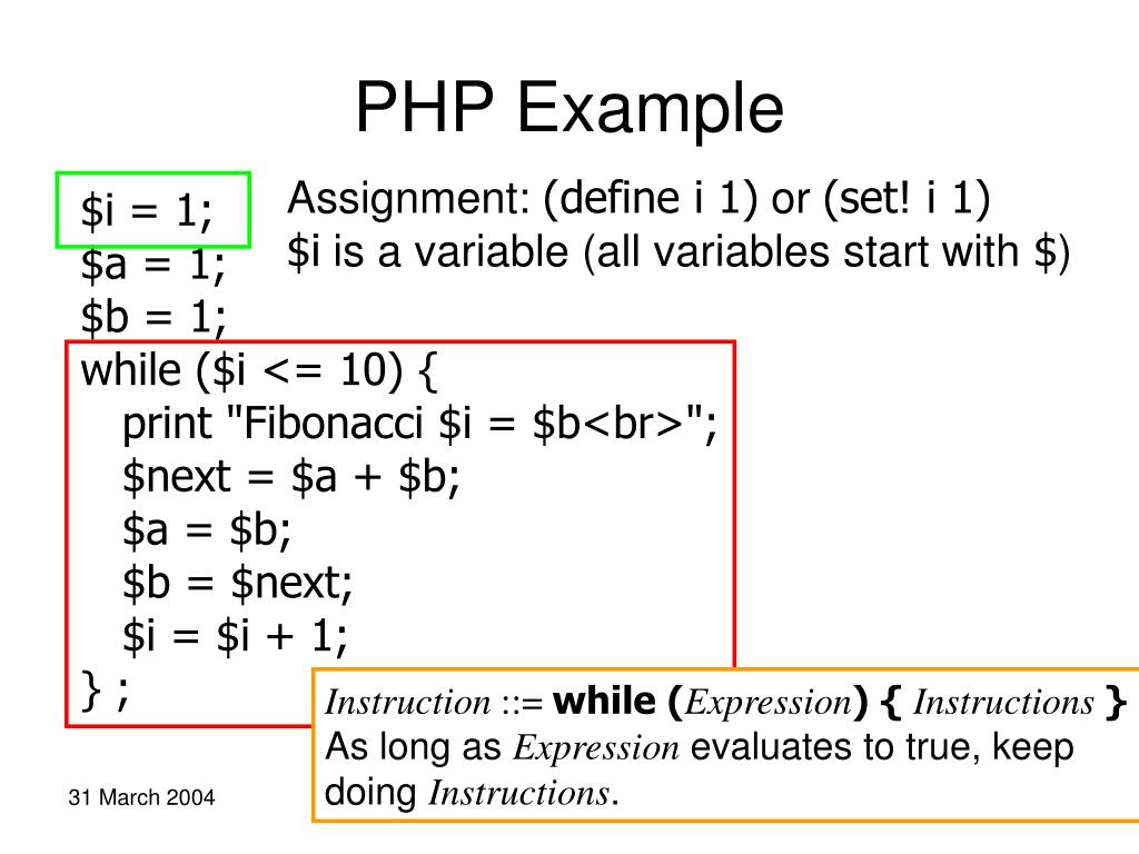 PHP Example Assignment: (define i 1) or (set! i 1) $i is a variable (all variables start with $) $i = 1; $a = 1; $b = 1; while ($i <= 10) { print "Fibonacci $i = $b<br>"; $next = $a + $b; $a = $b; $b = $next; $i = $i + 1; } ; Instruction ::= while (Expression) {Instructions} As long as Expressionevaluates to true, keep doing Instructions. CS 200 Spring 2004