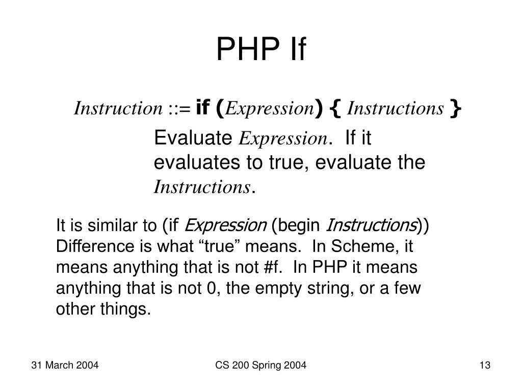 PHP If Instruction ::= if (Expression) {Instructions} Evaluate Expression. If it evaluates to true, evaluate the Instructions. It is similar to (if Expression (begin Instructions)) Difference is what “true” means. In Scheme, it means anything that is not #f. In PHP it means anything that is not 0, the empty string, or a few other things. CS 200 Spring 2004