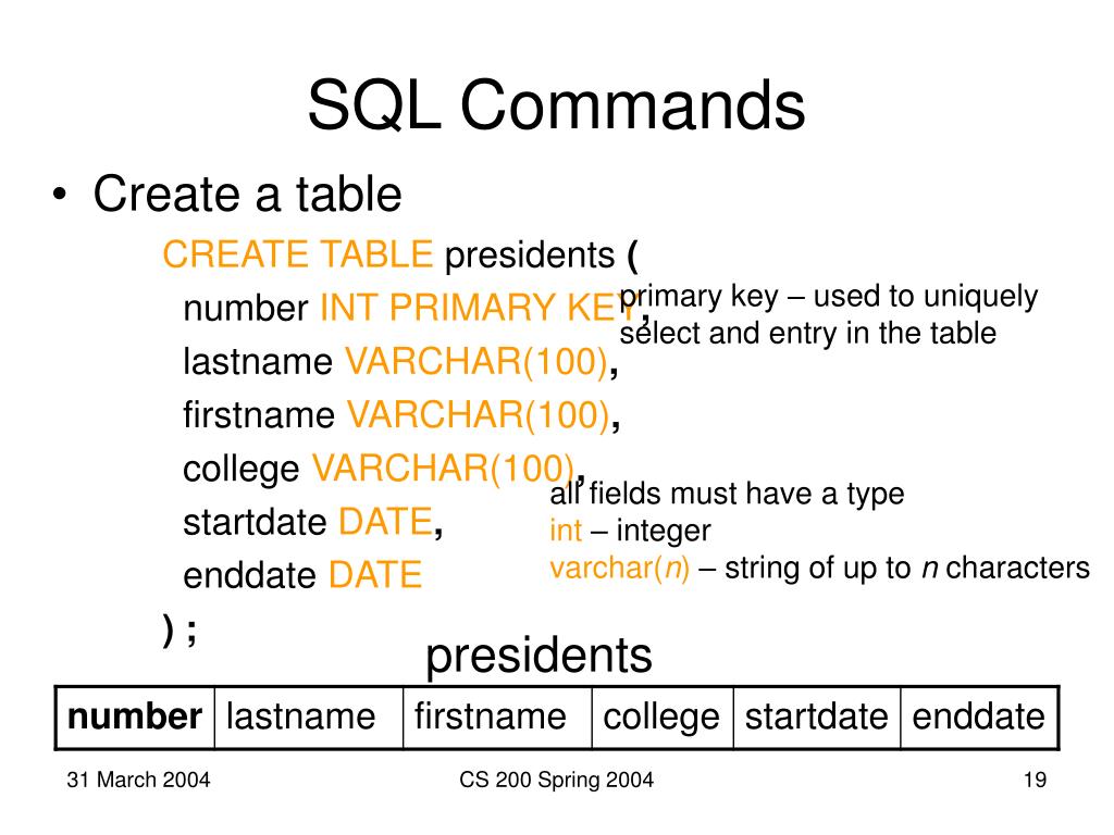 SQL Commands • Create a table CREATE TABLE presidents ( number INT PRIMARY KEY, lastname VARCHAR(100), firstname VARCHAR(100), college VARCHAR(100), startdate DATE, enddate DATE ) ; primary key – used to uniquely select and entry in the table all fields must have a type int – integer varchar(n) – string of up to n characters presidents CS 200 Spring 2004