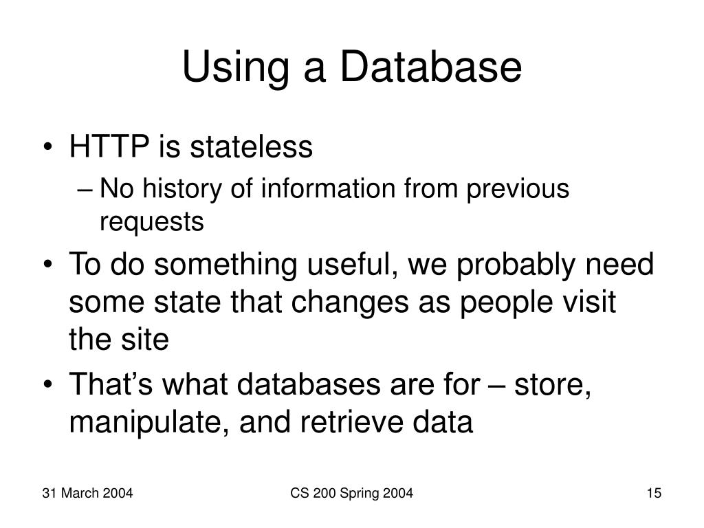 Using a Database • HTTP is stateless • No history of information from previous requests • To do something useful, we probably need some state that changes as people visit the site • That’s what databases are for – store, manipulate, and retrieve data CS 200 Spring 2004