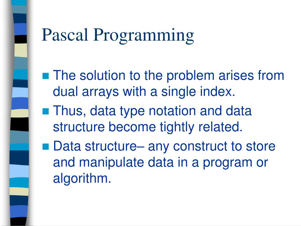 Pascal Programming • The solution to the problem arises from dual arrays with a single index. • Thus, data type notation and data structure become tightly related. • Data structure– any construct to store and manipulate data in a program or algorithm.