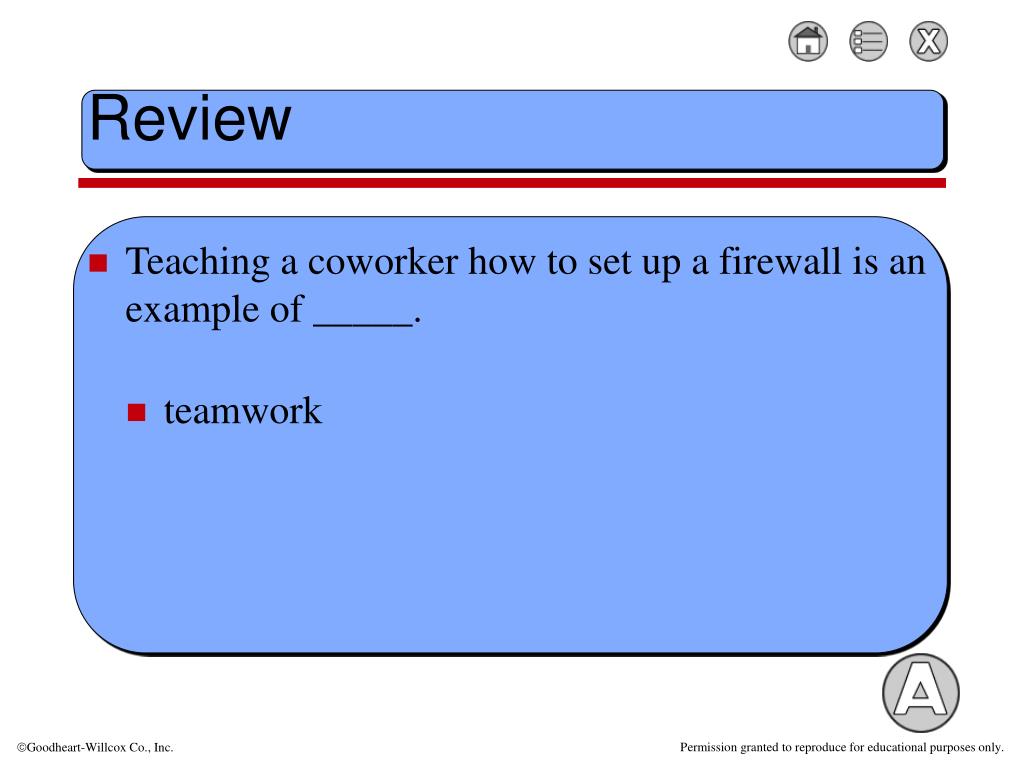 Review • Teaching a coworker how to set up a firewall is an example of _____. • teamwork