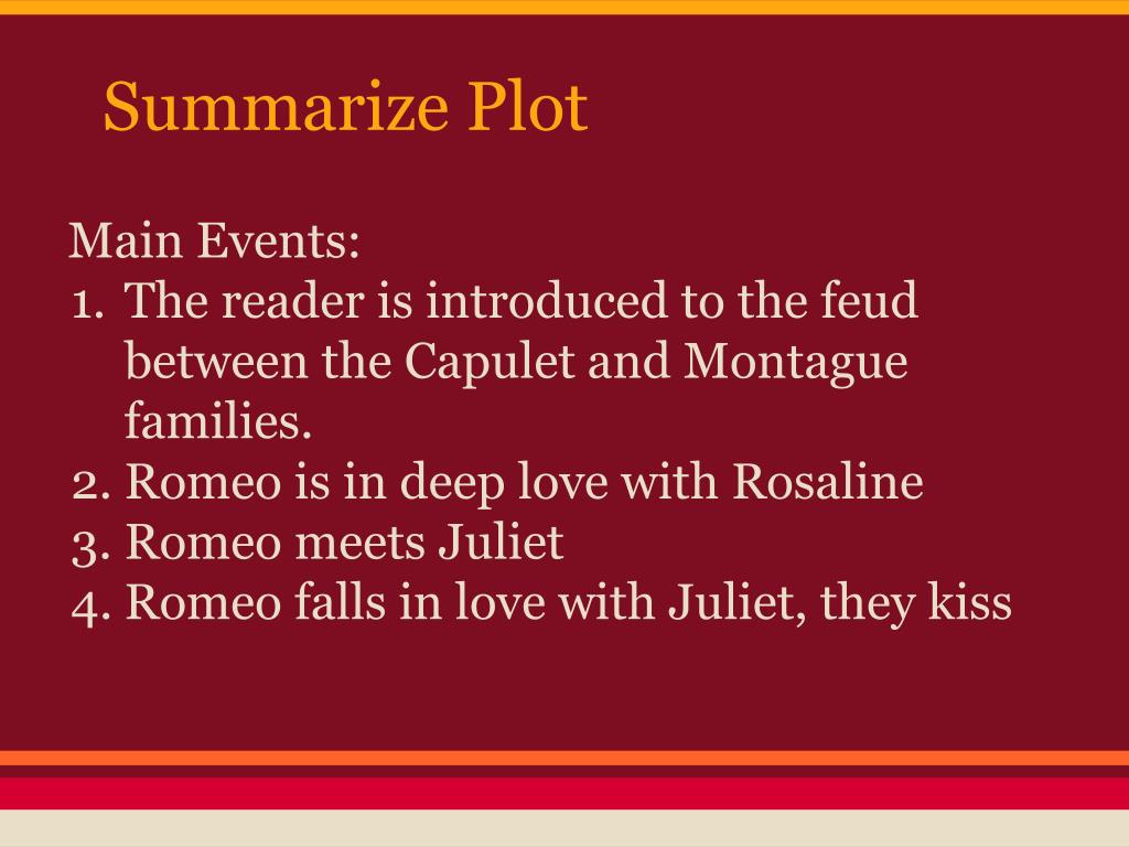 Summarize Plot Main Events: • The reader is introduced to the feud between the Capulet and Montague families. • Romeo is in deep love with Rosaline • Romeo meets Juliet • Romeo falls in love with Juliet, they kiss