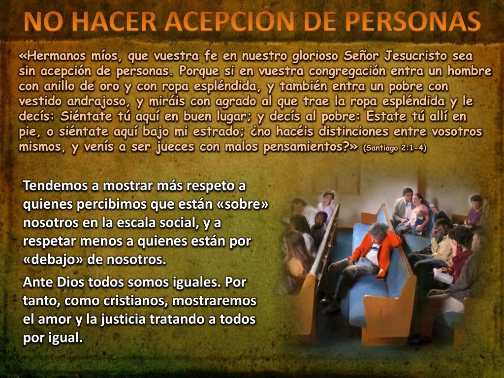 NO HACER ACEPCIÓN DE PERSONAS «Hermanos míos, que vuestra fe en nuestro glorioso Señor Jesucristo sea sin acepción de personas. Porque si en vuestra congregación entra un hombre con anillo de oro y con ropa espléndida, y también entra un pobre con vestido andrajoso, y miráis con agrado al que trae la ropa espléndida y le decís: Siéntate tú aquí en buen lugar; y decís al pobre: Estate tú allí en pie, o siéntate aquí bajo mi estrado; ¿no hacéis distinciones entre vosotros mismos, y venís a ser jueces con malos pensamientos?» (Santiago 2:1-4) Tendemos a mostrar más respeto a quienes percibimos que están «sobre» nosotros en la escala social, y a respetar menos a quienes están por «debajo» de nosotros. Ante Dios todos somos iguales. Por tanto, como cristianos, mostraremos el amor y la justicia tratando a todos por igual.