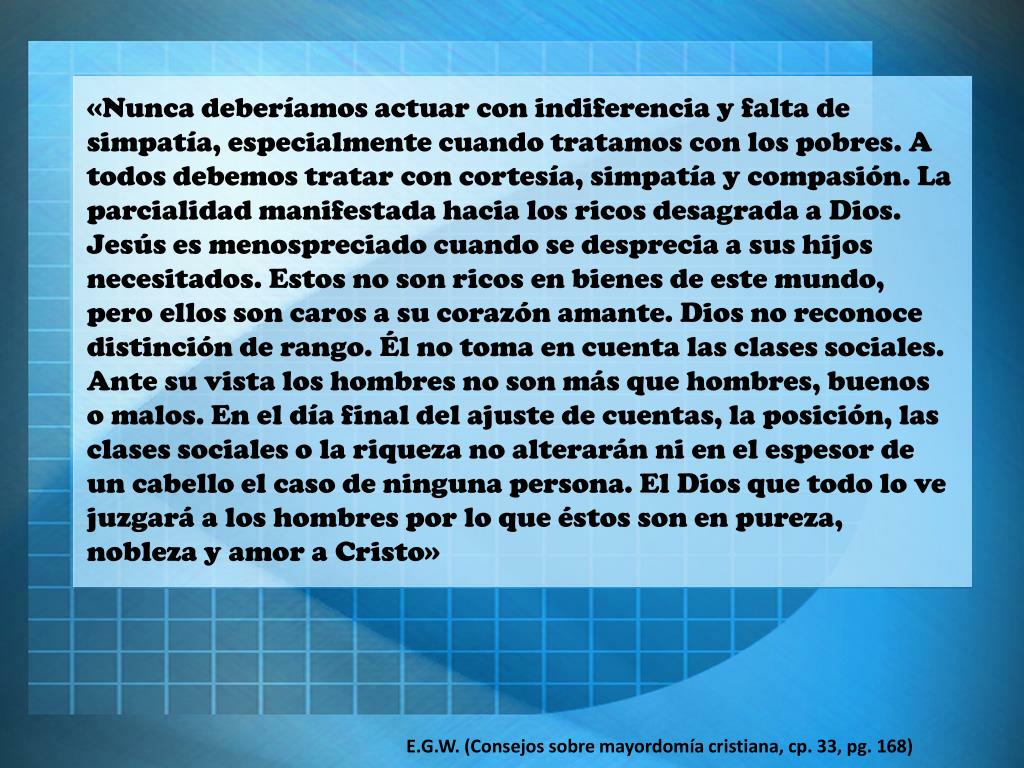 «Nunca deberíamos actuar con indiferencia y falta de simpatía, especialmente cuando tratamos con los pobres. A todos debemos tratar con cortesía, simpatía y compasión. La parcialidad manifestada hacia los ricos desagrada a Dios. Jesús es menospreciado cuando se desprecia a sus hijos necesitados. Estos no son ricos en bienes de este mundo, pero ellos son caros a su corazón amante. Dios no reconoce distinción de rango. Él no toma en cuenta las clases sociales. Ante su vista los hombres no son más que hombres, buenos o malos. En el día final del ajuste de cuentas, la posición, las clases sociales o la riqueza no alterarán ni en el espesor de un cabello el caso de ninguna persona. El Dios que todo lo ve juzgará a los hombres por lo que éstos son en pureza, nobleza y amor a Cristo» E.G.W. (Consejos sobre mayordomía cristiana, cp. 33, pg. 168)