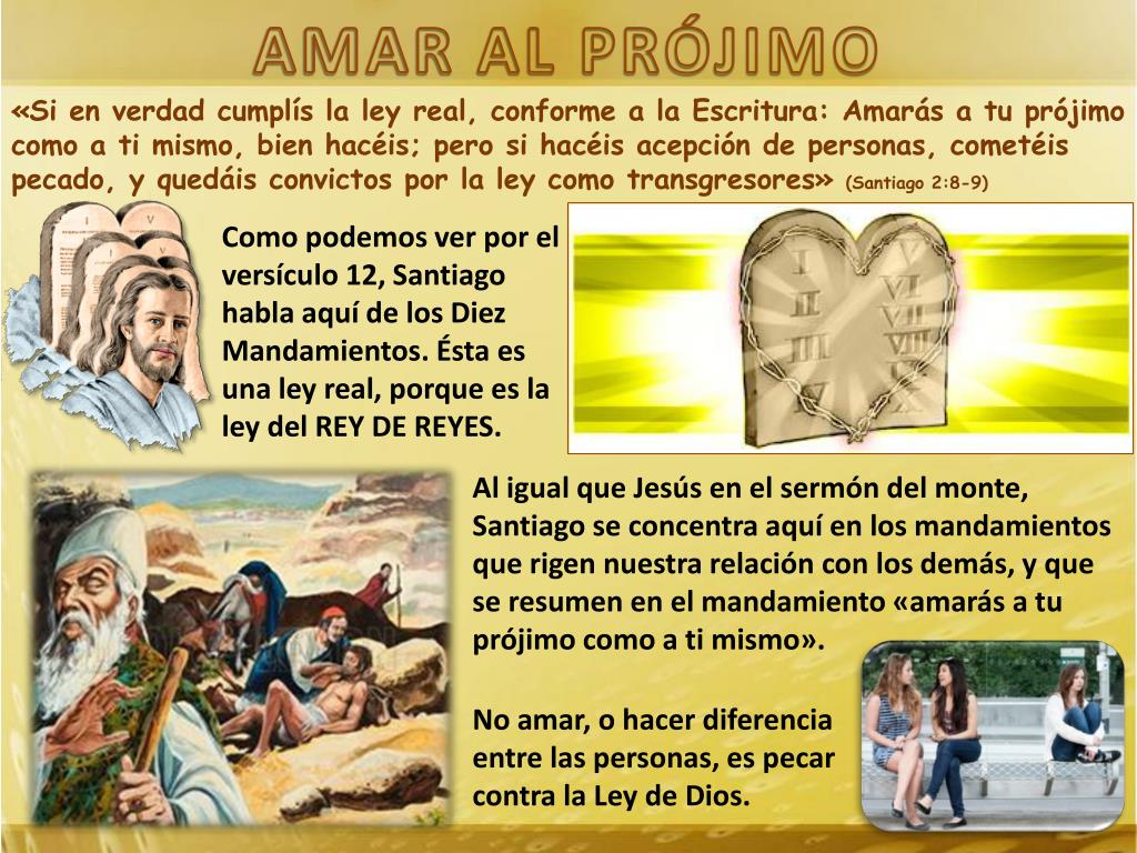AMAR AL PRÓJIMO «Si en verdad cumplís la ley real, conforme a la Escritura: Amarás a tu prójimo como a ti mismo, bien hacéis; pero si hacéis acepción de personas, cometéis pecado, y quedáis convictos por la ley como transgresores» (Santiago 2:8-9) Como podemos ver por el versículo 12, Santiago habla aquí de los Diez Mandamientos. Ésta es una ley real, porque es la ley del REY DE REYES. • Al igual que Jesús en el sermón del monte, Santiago se concentra aquí en los mandamientos que rigen nuestra relación con los demás, y que se resumen en el mandamiento «amarás a tu prójimo como a ti mismo». • No amar, o hacer diferencia entre las personas, es pecar contra la Ley de Dios.