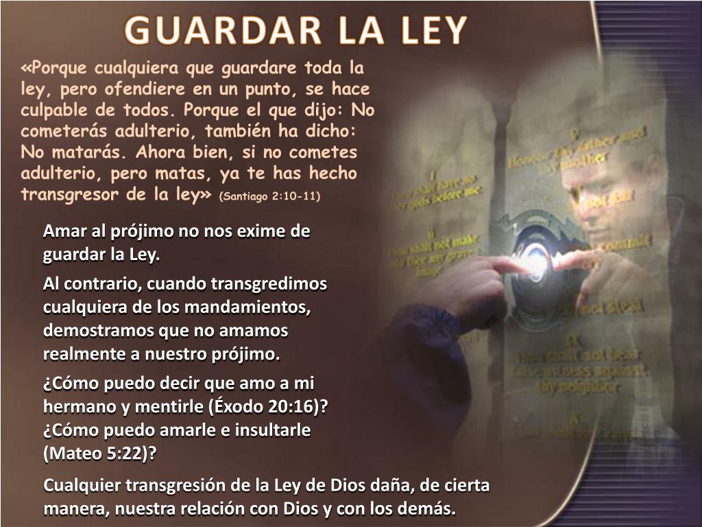 GUARDAR LA LEY «Porque cualquiera que guardare toda la ley, pero ofendiere en un punto, se hace culpable de todos. Porque el que dijo: No cometerás adulterio, también ha dicho: No matarás. Ahora bien, si no cometes adulterio, pero matas, ya te has hecho transgresor de la ley» (Santiago 2:10-11) Amar al prójimo no nos exime de guardar la Ley. Al contrario, cuando transgredimos cualquiera de los mandamientos, demostramos que no amamos realmente a nuestro prójimo. ¿Cómo puedo decir que amo a mi hermano y mentirle (Éxodo 20:16)? ¿Cómo puedo amarle e insultarle (Mateo 5:22)? • Cualquier transgresión de la Ley de Dios daña, de cierta manera, nuestra relación con Dios y con los demás.