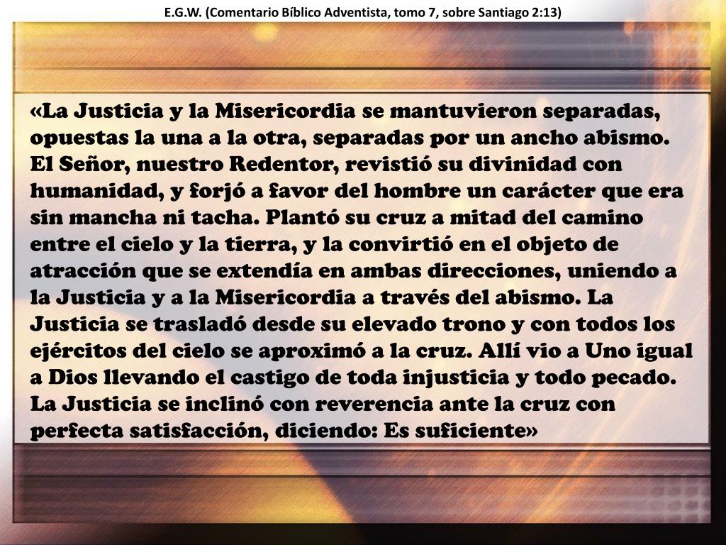 E.G.W. (Comentario Bíblico Adventista, tomo 7, sobre Santiago 2:13) «La Justicia y la Misericordia se mantuvieron separadas, opuestas la una a la otra, separadas por un ancho abismo. El Señor, nuestro Redentor, revistió su divinidad con humanidad, y forjó a favor del hombre un carácter que era sin mancha ni tacha. Plantó su cruz a mitad del camino entre el cielo y la tierra, y la convirtió en el objeto de atracción que se extendía en ambas direcciones, uniendo a la Justicia y a la Misericordia a través del abismo. La Justicia se trasladó desde su elevado trono y con todos los ejércitos del cielo se aproximó a la cruz. Allí vio a Uno igual a Dios llevando el castigo de toda injusticia y todo pecado. La Justicia se inclinó con reverencia ante la cruz con perfecta satisfacción, diciendo: Es suficiente»