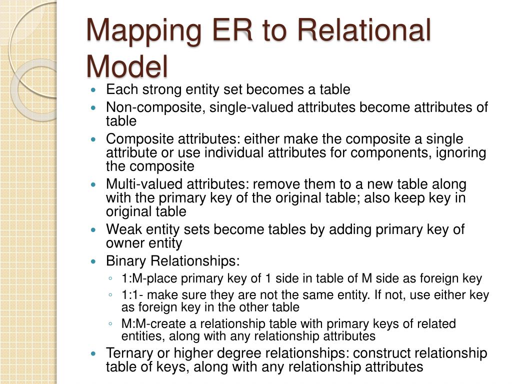 Mapping ER to Relational Model • Each strong entity set becomes a table • Non-composite, single-valued attributes become attributes of table • Composite attributes: either make the composite a single attribute or use individual attributes for components, ignoring the composite • Multi-valued attributes: remove them to a new table along with the primary key of the original table; also keep key in original table • Weak entity sets become tables by adding primary key of owner entity • Binary Relationships: • 1:M-place primary key of 1 side in table of M side as foreign key • 1:1- make sure they are not the same entity. If not, use either key as foreign key in the other table • M:M-create a relationship table with primary keys of related entities, along with any relationship attributes • Ternary or higher degree relationships: construct relationship table of keys, along with any relationship attributes