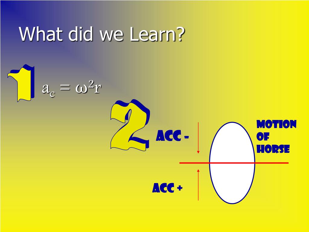 Motion of horse Acc - Acc + What did we Learn? ac = ω2r 1 2