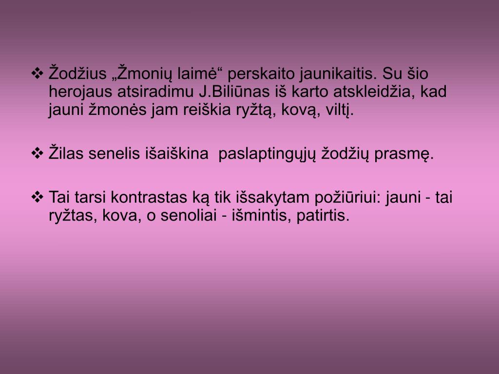 Žodžius „Žmonių laimė“ perskaito jaunikaitis. Su šio herojaus atsiradimu J.Biliūnas iš karto atskleidžia, kad jauni žmonės jam reiškia ryžtą, kovą, viltį. • Žilas senelis išaiškina paslaptingųjų žodžių prasmę. • Tai tarsi kontrastas ką tik išsakytam požiūriui: jauni - tai ryžtas, kova, o senoliai - išmintis, patirtis.